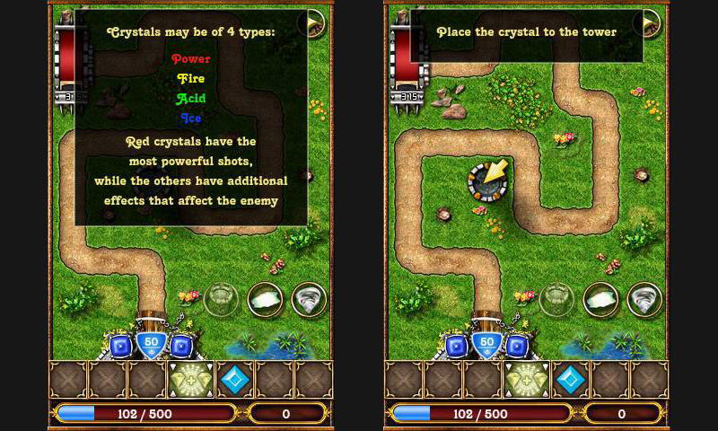 It’s very useful to enchant crystals. Click on crystal to select it and then press one of the buttons: ‘Increase range of crystal’ (crystal can attack enemies from longer distance) and ‘Increase firing speed’ (crystal shoots more frequently).