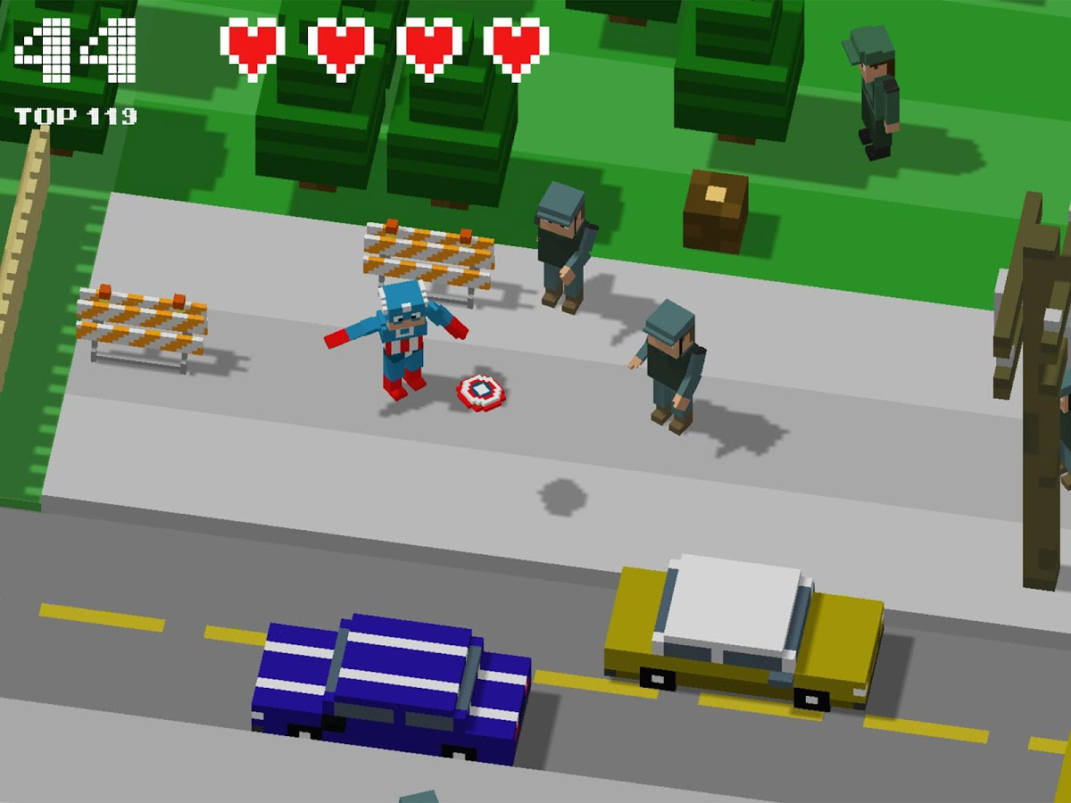 This game packs tons of the things you’ve come to love about road crossing games but ups the ante x 2! Crossy Heroes brings the road crossing genre to the next level! You’ll marvel at the diverse challenges. There are cars, road, rivers and logs, but now throw in sentry turrets, pistols, bombs, force fields, enemy bases, heroes shooting special powers and cities crawling with armed, free-roaming, gun shooting enemy soldiers!