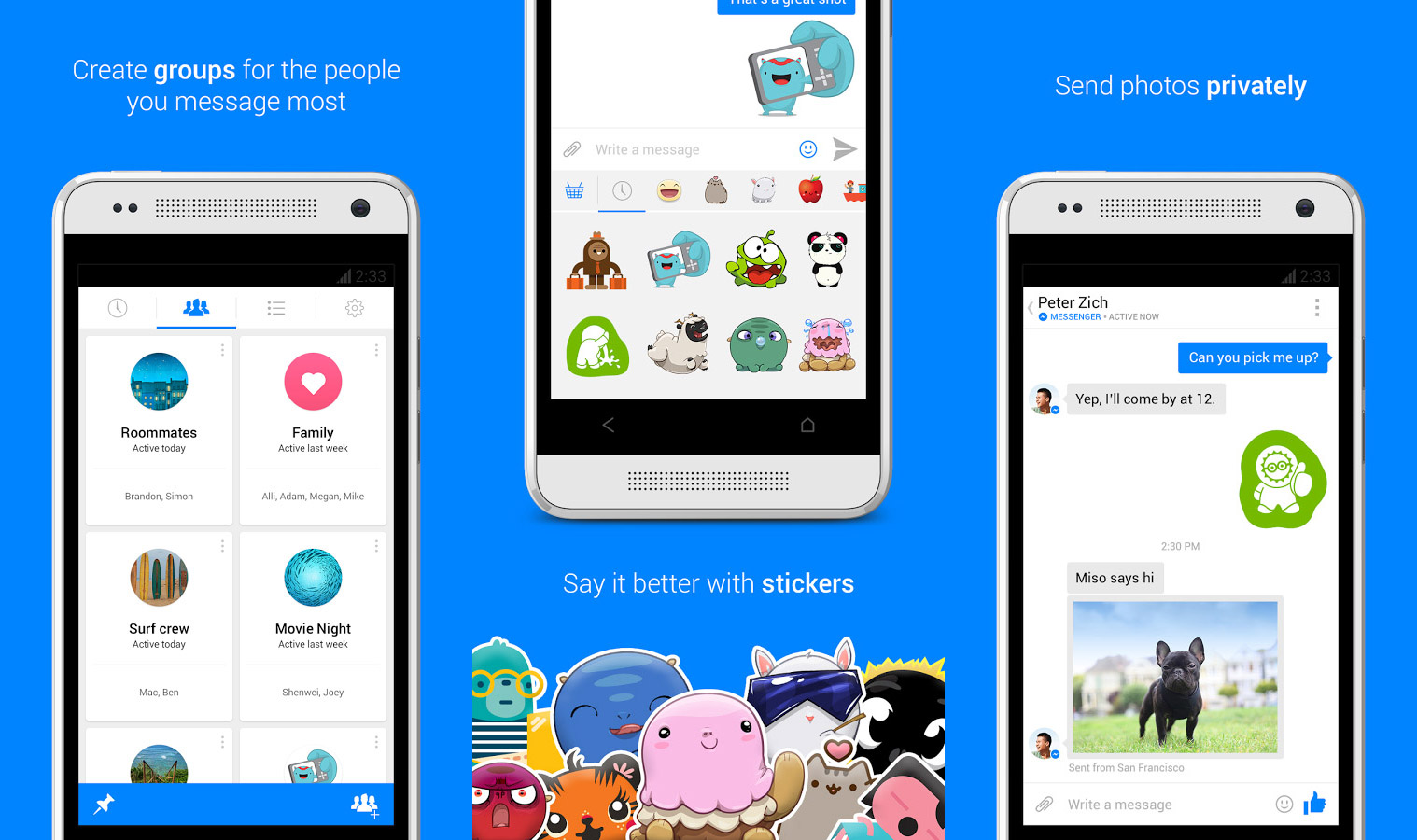 Facebook Messenger features receiving messages without opening Facebook application; Chat with groups; Many stickers to express your mood; sending photos; record voice messages; make free calls and know when people have seen your messages (very important).
