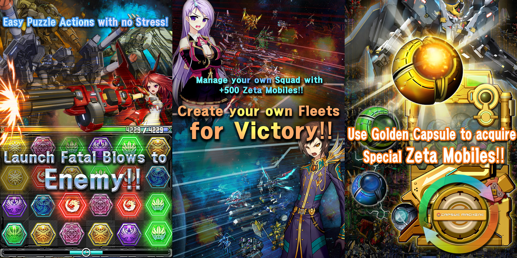 In puzzles, you have to line two or more cores of same color in a vertical, horizontal, and diagonal way in limited time. Line as many cores to create series of combos for additional points. Zeta Mobiles with same color as lined Core will Attack enemy. Destroy and defeat all enemy with series of combos before they have chance to strike. Acquire new Zeta Mobiles as rewards from exploration. There is a number of combinations of Zeta Mobiles to personalize your own original Squad. Zeta Mobiles can be acquired from Capsule Machines as well. You can also increase your Zeta Mobile’s ability with Power-Up Fusion. Zeta Mobile at max level can Evolve by fusing with certain material ZMs!