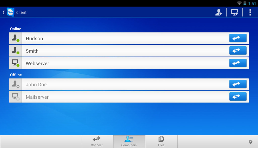TeamViewer features intuitive gestures Touch Operation including sensor support for Windows 8. There is full functionality of the keyboard and you can transfer files in both directions. You don’t need to worry about hack attacks, because TeamViewer boasts highest security standards : 256 Bit AES Session Encoding, 2048 Bit RSA Key Exchange.